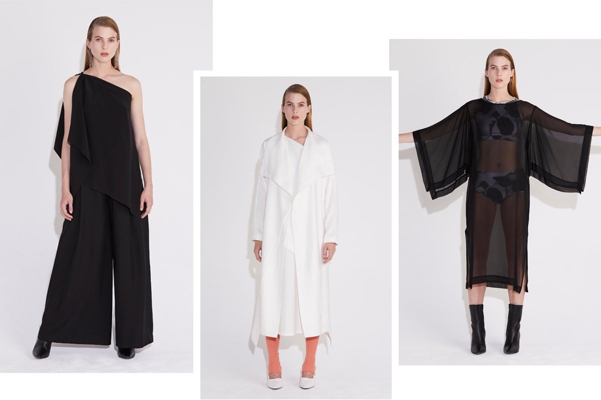Left: Azimuth Top, Axis Pant. Center: Axis Trench Dress. Right: Memory Dress