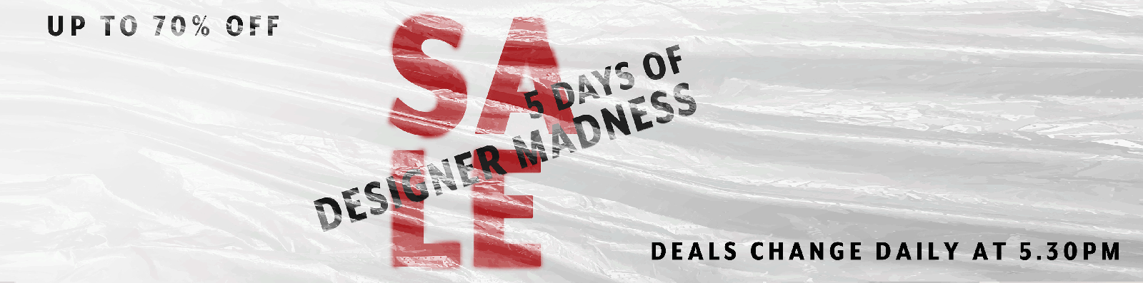 5 Days of Designers Madness! Keep an eye out for deals that will change daily from 5.30pm, never to be repeated. Up to 70% off selected International Designers. Sale on now! *Please note, no returns, refunds or exchanges on sale items.